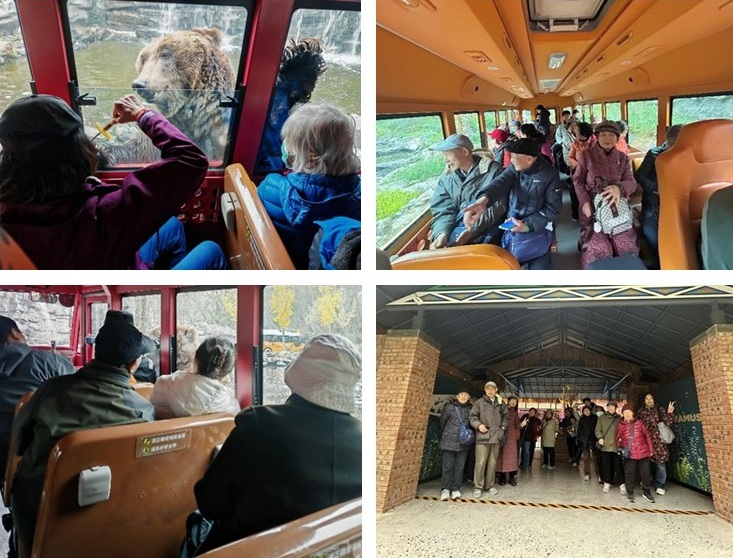 入园后,离退休老师们首先在带队老师和学生志愿者的引导下,一同坐上了观光大巴进入猛兽区近距离观赏美洲豹、东北虎、非洲狮、棕熊等大型食肉动物。观光途中,大家兴致勃勃地讨论着动物们的生活习性,时而转头与身边的学生志愿者热络攀谈,绘声绘色地分享起当年在实验室里并肩协作的难忘点滴,言语间满是对往昔岁月的怀念与自豪,车厢内不时传来阵阵爽朗的笑声。