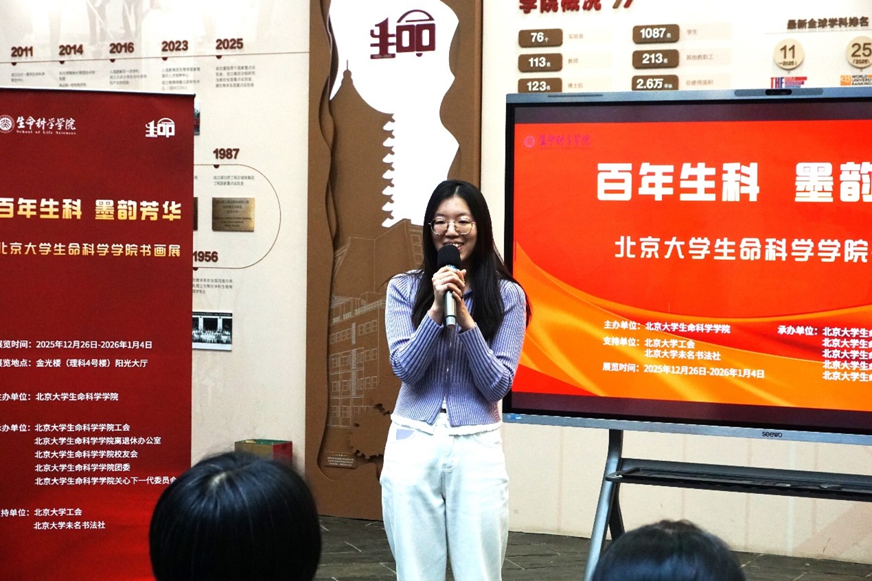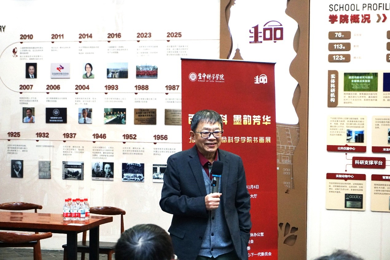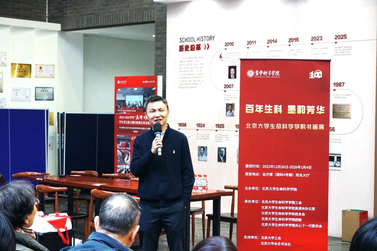 2025年12月26日,“百年生科·墨韵芳华”—yl6809永利官网书画展在金光楼(理科四号楼)开幕。北京大学工会常务副主席张宝岭,党委宣传部副部长唐平,工会副主席张小萌,工会原副主席、医学部工会原常务副主席刘穗燕,化学与分子工程学院教授、未名书法社社长、校友书画协会副会长沈兴海,工会文体部部长朱博雅,yl6809永利官网院长陈雪梅,党委书记石长翼,中国科学院院士、yl6809永利官网教授赵进东,党委副书记郑晓峰,党委副书记曲一铭,北京大学工会副主席(兼)、yl6809永利官网工会主席范六民,院长助理彭宜本,以及学院教师代表、离退休教师代表和学生代表等出席。
