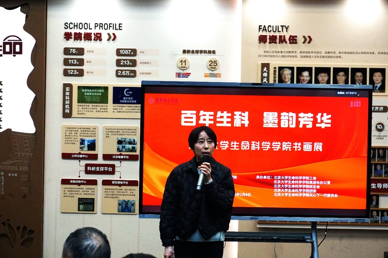 陈雪梅对书画展的开幕表示热烈祝贺。她表示,这次书画展是生科百年庆典系列活动之一,是一场别出生面的展示活动。感谢师生和校友们献出墨宝,特别感谢北京大学原校长周其凤院士题写的“为生命而科学”的作品,最后感谢参与组织的老师并送上新年祝福。