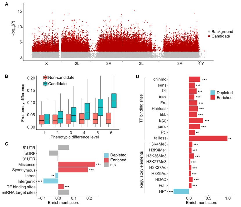 研究共鉴定出57,433个与饥饿耐受显著相关的SNP。在不同饥饿耐受表型的样本中,这些SNP的等位基因频率差异随表型分化程度加大而逐渐扩大,表明饥饿耐受具有多基因微效的遗传架构。进一步分析显示,与饥饿耐受关联最显著的SNP所涉及的基因中,富集了之前自然群体研究中鉴定的受正选择的基因(Chen et al. 2024),提示这些基因可能参与了环境适应。功能注释分析表明,饥饿耐受相关位点显著富集于蛋白质编码区、部分转录因子结合位点,以及H3K4Me3、H3K4Me1等转录激活相关组蛋白修饰区域,而在异染色质区域(如HP1结合区)则显著稀少(图2)。