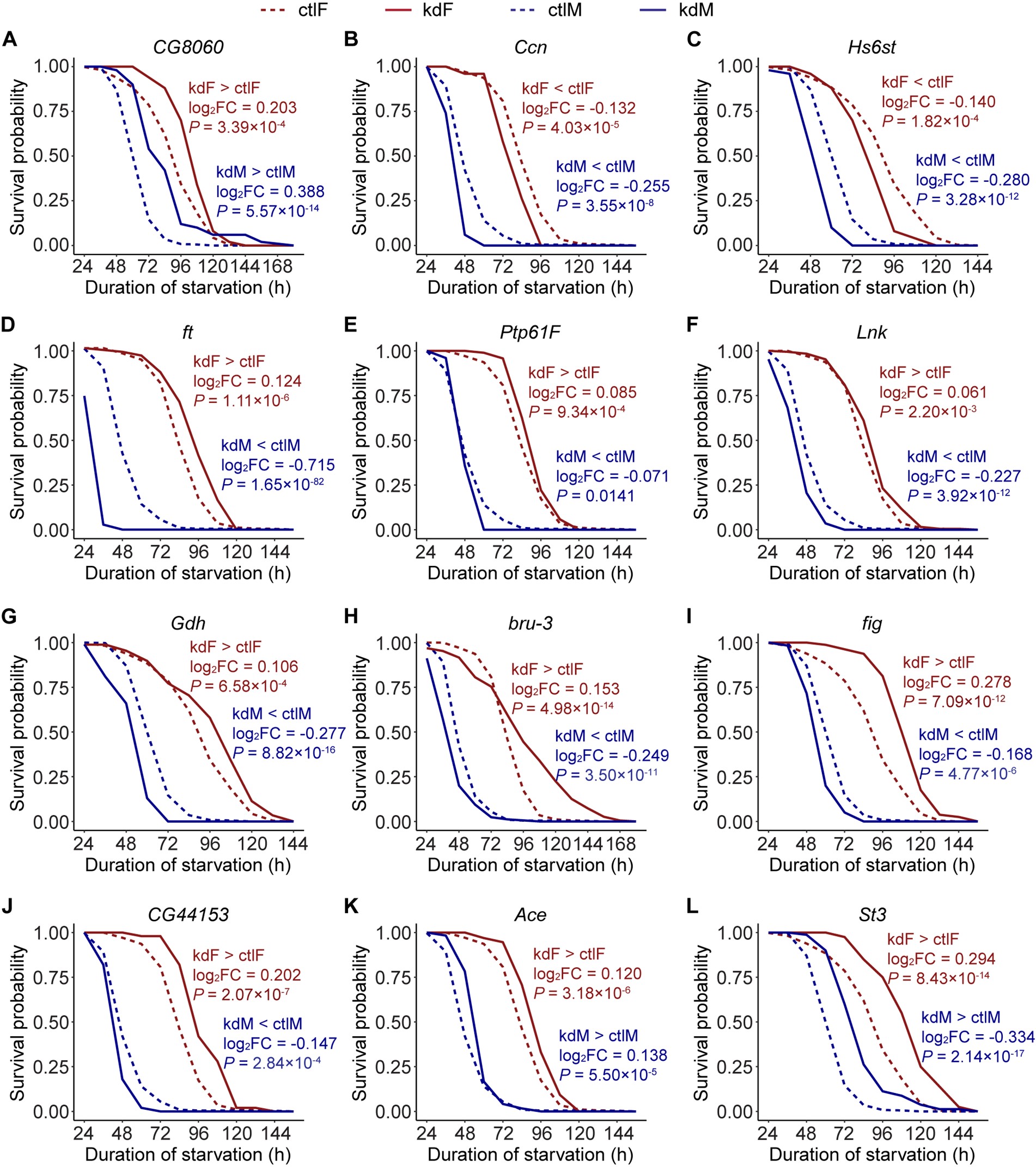 接着,研究用RNA干扰敲低实验对131个候选基因进行了功能验证。RNA干扰实验表明,在77个敲低不致死的候选基因中,85.7%(66个)的基因影响饥饿耐受表型,其中49个基因表现出性别依赖的表型效应,包括12个表现出性别冲突效应的基因,这些基因敲低后增强了雌性饥饿耐受能力却降低雄性耐受能力(图4)。进一步研究表明,这种性别依赖的表型效应无法通过基因的性别偏向性表达或雌雄中敲低效率差异解释。研究还发现部分候选基因具有多效性,例如,著名的杀虫剂抗性基因Ace的高表达原本与更强的抗药性相关,但其敲低却增强了饥饿耐受能力;同样,抗感染相关基因St3的敲低也显著提高了饥饿耐受能力。这表明饥饿耐受相关基因的演化可能受到多种自然选择压力的影响。