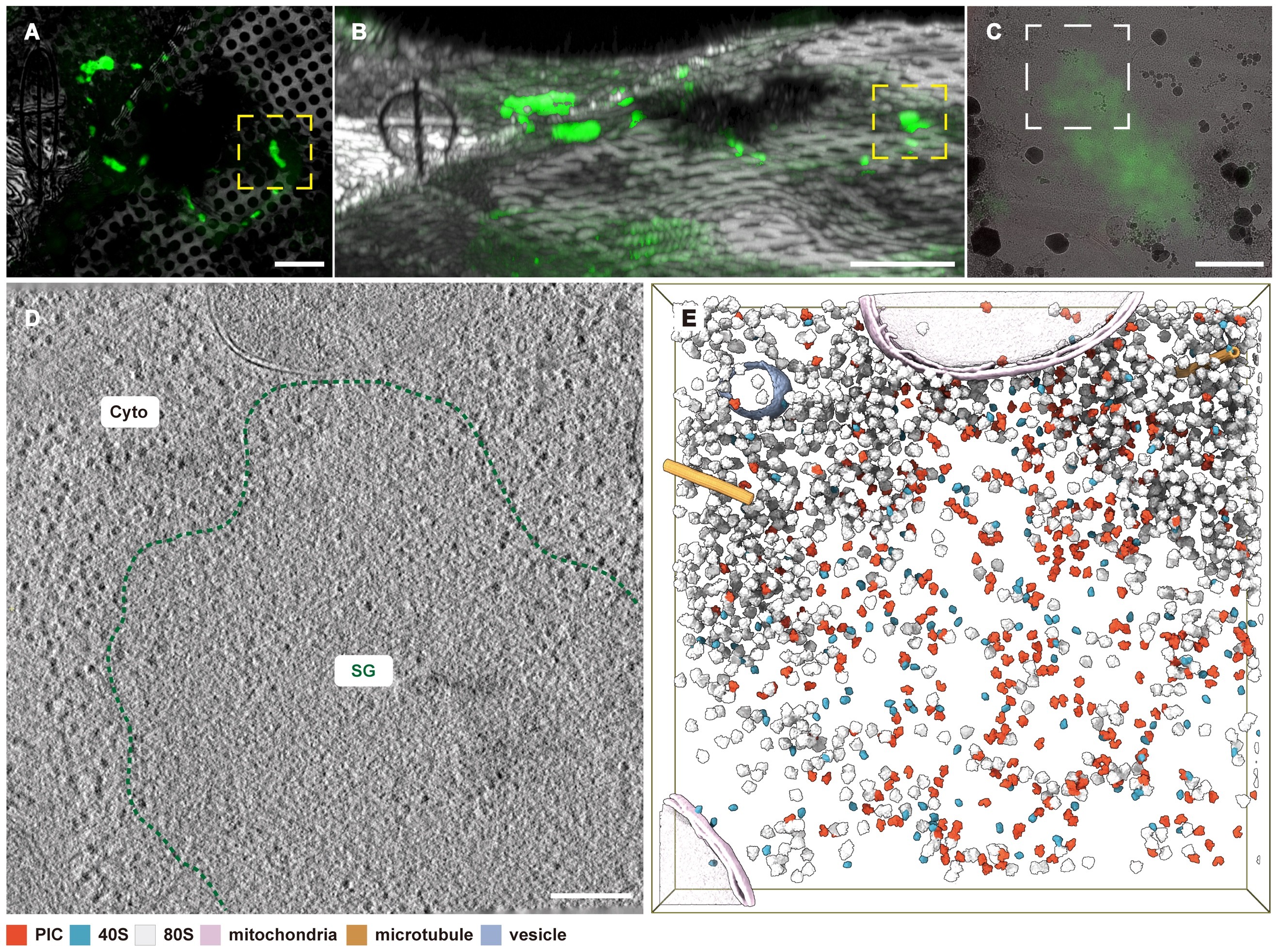 应激颗粒(Stress Granules, SGs)是细胞在应对氧化应激、温度变化或病毒感染等压力时通过液-液相分离组装形成的动态无膜细胞器,其主要成分包括翻译停滞的mRNA、翻译调控因子以及多种影响mRNA命运的RNA结合蛋白。已有报道显示应激颗粒具有重要的生理意义,其功能异常与包括神经退行性疾病在内的多种疾病相关1。应激颗粒的形成通常伴随着全局翻译的抑制,但其精确的形成过程、调节机制及生物学功能仍未完全明确,这在一定程度上受限于对其精细结构了解的不足。近年来发展的冷冻电子断层成像技术可对细胞内的亚细胞结构进行高分辨原位成像,但由于缺乏明确边界和明显内部特征,对包括应激颗粒在内的无膜细胞器的原位结构解析依然十分有限。