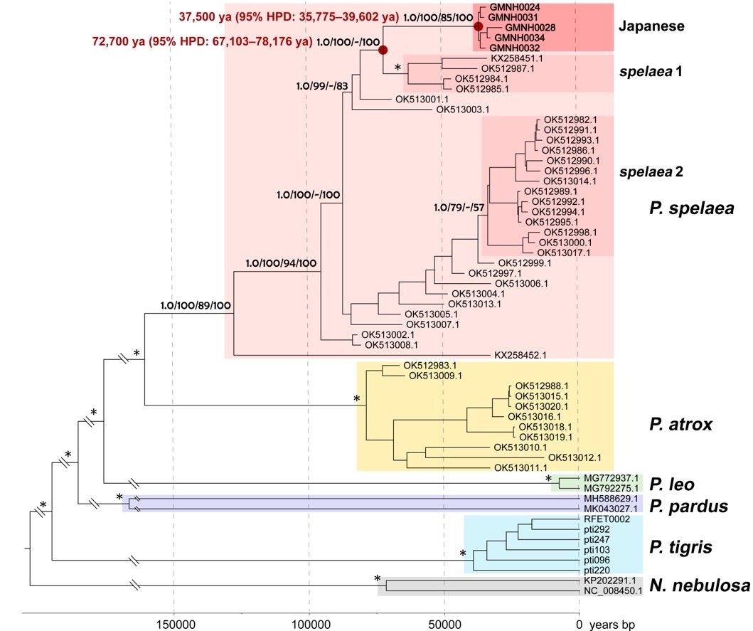 图3. 基于线粒体组的系统发生树显示,日本多地出土的晚更新世大型猫科动物遗骸属于已灭绝的洞狮(P. spelaea),其与欧亚大陆洞狮支系spelaea 1最为接近。