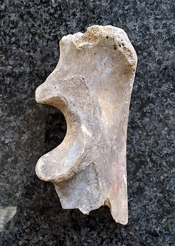 图4. 发掘自日本本州岛西部山口县的猫科动物尺骨标本“宇伊”,现存于日本山口县美祢市历史民俗博物馆,曾被认为是虎。本研究通过古基因组学和古蛋白质组学证据确认其为洞狮(Panthera spelaea),并通过碳-14测年确定其生活年代为距今约35,000年前的晚更新世(摄影:山口诚之)。