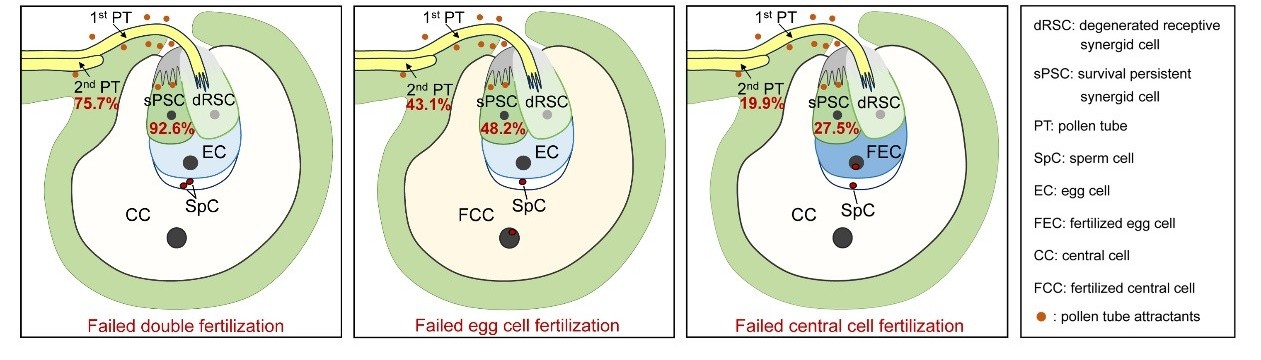 被子植物是陆地生态系统的重要组成部分,其演化的成功在很大程度上依赖于其高效的有性生殖方式。一方面,被子植物通过持续生长的花粉管在助细胞分泌的花粉管吸引信号的引导下精准进入胚囊释放两个精细胞到雌配子附近,这种粉管授粉的方式让被子植物的有性生殖过程摆脱了对水的依赖。另一方面,被释放出的两个精细胞可以分别与卵细胞和中央细胞融合,形成胚和胚乳。在种子发育过程中,胚和胚乳协同发育,胚乳为传递遗传物质的胚提供了重要的营养,因此被子植物特有的这种双受精的受精方式为其高效地繁殖后代提供了重要的保障。然而,在自然条件波动或遗传缺陷的影响下,双受精并非总能成功。为应对这一风险,被子植物在进化过程中形成了一种重要的生殖“补救”机制--受精补偿(Fertilization recovery)机制:当第一根花粉管未能完成受精时,胚珠中尚未降解的宿存助细胞继续分泌花粉管吸引信号,吸引第二根花粉管,为受精提供额外机会。尽管这一现象早已被观察到,但由于双受精包含卵细胞与中央细胞两次相互独立的受精事件,这两次事件在多大程度上影响宿存助细胞的存活以及受精补偿效率缺乏系统、定量的观察和分析,使得该问题成为植物生殖领域的一个长期未阐明的问题。