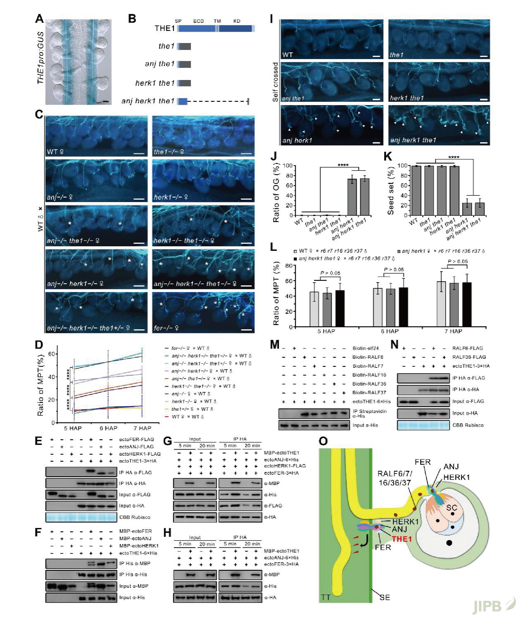 该项研究还首次发现, THE1胞外域与FER、ANJ、HERK1相互作用, 且更多受体组分的加入能稳定受体复合物两两间的相互作用。此外, THE1同样结合五个已知RALF小肽, 但与FER, ANJ和HERK1不同, 其并不参与花粉管接受过程, 说明其在生殖过程中功能的特异性 (图1)。上述结果不仅找到了完善隔膜处阻止多花粉管穿出的CrRLK1L-RALF复合物的一块重要“拼图”, 也促进了研究者认识FER如何与CrRLK1L家族不同成员形成复合体来调控不同的生物学过程。该研究为理解植物有性生殖过程中雌雄互作的分子调控机制提供了新视角, 也为进一步解析阻止多根花粉管穿出的信号奠定了基础。