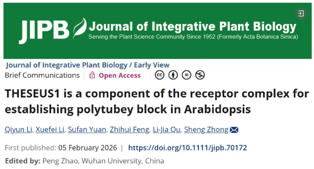 2026年2月5日, 北京大学钟声课题组在JIPB在线发表了题为“THESEUS1 is a component of the receptor complex for establishing polytubey block in Arabidopsis”的研究论文。该研究通过遗传与生化分析, 发现THESEUS1 (THE1) 是FER/ANJ/HERK1受体复合物的新组分, 共同参与建立隔膜处阻止多根花粉管穿出的屏障。研究显示, 虽然THE1单突变不影响表型, 但其与ANJ或HERK1的双突变体多花粉管穿出比例显著上升, 而anj herk1 the1三突变体表型与fer突变体相当, 表明THE1在该复合物中与ANJ和HERK1功能冗余, FER则为该复合体的支架蛋白 (图1)。