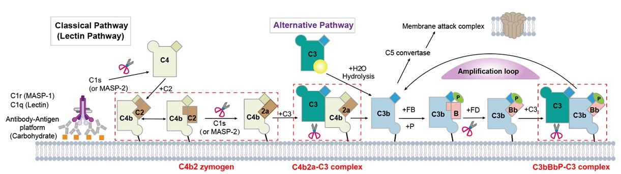 图1. 补体级联通路示意图。红色标记为本研究中解析完成的复合物